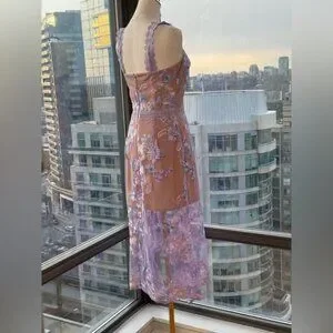 The Bronx And Banco Eva Embroidered High-Low Illusion Midi Dress features an embroidered floral design and an asymmetrical hem, with lace detailed straps. It also has a hidden zipper closure at the back. The dress is made from a sheer fabric, and it is midi length. It is fully lined. This dress is a romantic option for special occasions, cocktail parties or a brunch.