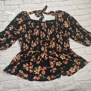 Chic black blouse with vibrant floral pattern. Features a stylish tie detail on the shoulder.