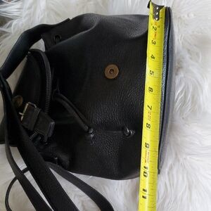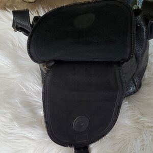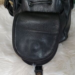 This sleek black sturdy leather bag features a structured design with a convenient flap closure for secure storage. The adjustable shoulder straps ensure a comfortable fit, making it perfect for daily use or travel. Crafted from durable materials, this bag combines style and functionality effortlessly.
