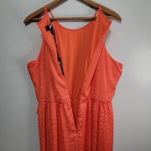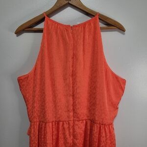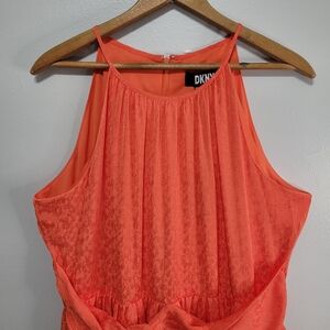 New with tags DKNY orange halter style lined sleeveless dress with zip closure size 16. This dress has a twist waist detail on the front and a floral pattern. Dry clean only. 100% polyester. All measurements are approximate and taken laying flat.
