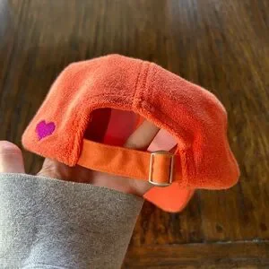 Cutest hat for summer! Perfect for the beach or pool. Adjustable back. Soft orange terry cloth. Embroidered pink heart.