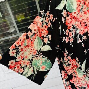Pre-owned and in great condition- no tags- Women's Plus Size OS Kimono by Janette Plus. Beautiful black with peach/pink florals & green foliage. Beautiful for the spring & summer and lightweight. Perfect over a shell, tank or t-shirt. Also can be worn as a robe or bathing suit coverup.