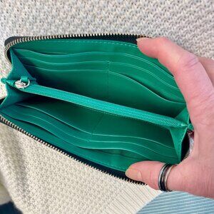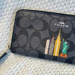 Like new adorable Coach wallet in signature black. Silver logo and zipper. Classic New York landmark design. Pop of color green interior. Eight credit card slots, four separate pockets for cash, etc. and a full zip change compartment.