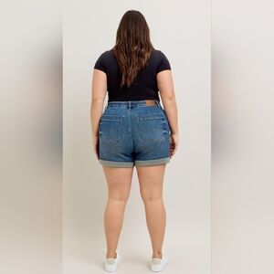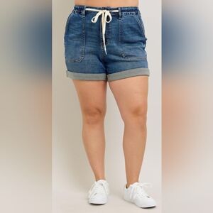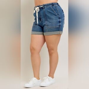 Judy Blue HR Dark Wash Tie Waist Patch Pocket Cuffed Denim Jogger Shorts NEW