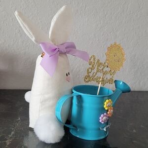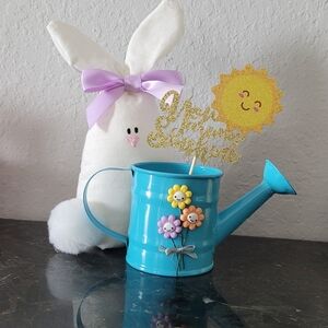 Blue Watering Can with Flowers and Bunny Decor