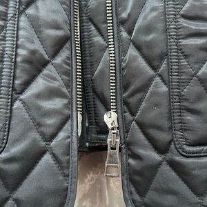 Stay stylish and warm with this black quilted jacket. Perfect for any occasion. Top zip is missing pull but still functional. Just dry cleaned so ready to be shipped out.