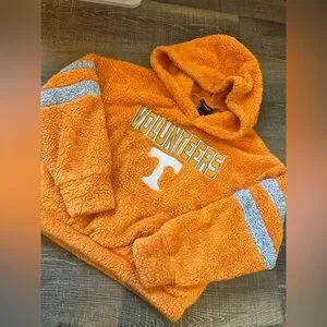 Cozy and stylish orange fuzzy hoodie with gray stripes. Perfect for keeping warm and comfortable . Minor wear consistent with this type of material.