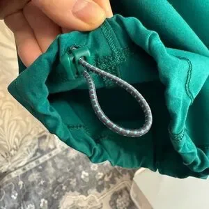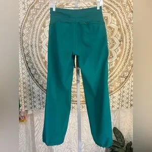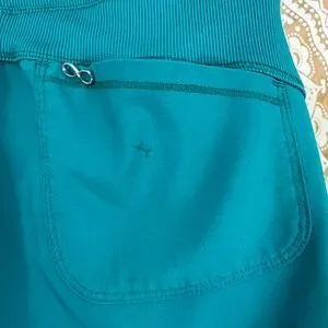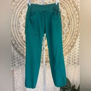 Stylish teal cargo jogger pants with multiple pockets. Healthcare scrubs. Perfect for casual wear as well. Pull cinch ties at ankles. Zipper pocket on right side. There is a small mark on back pocket.