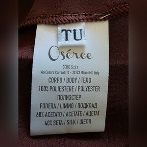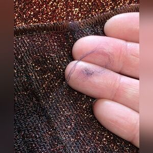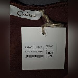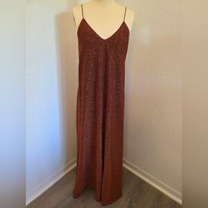Stylish One Size brown/copper maxi dress with a shimmering finish. Perfect for evening wear. Slip on dress with thin spaghetti straps that have stretch. Brand new, never worn, but I accidentally got it snagged on velcro so minor pull on some threads but it was difficult for me to spot and photograph. The snag is mainly on underside of fabric and to me not visible when worn. Polyester and silk. Dress is lined. Sold as is.
