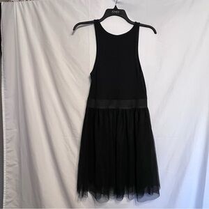 Chic black sleeveless dress with a tulle skirt. Perfect for any occasion.