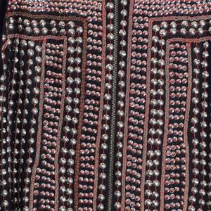Red accents, black dress and shiny metal studs. Zipper in the back.