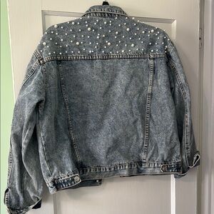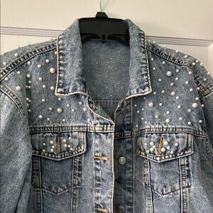 Elevate your style with this chic denim jacket featuring elegant pearl studs. Perfect for any casual outing.