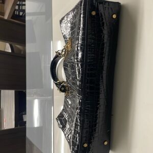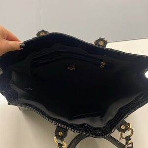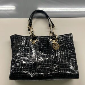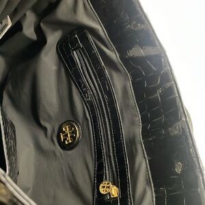 This stylish Tory Burch tote showcases a sleek black and silver color palette with a striking crocodile-embossed texture. Its structured design and spacious interior make it an ideal choice for everyday use or work. The bag is accentuated with silver hardware, adding a touch of elegance to its overall look.