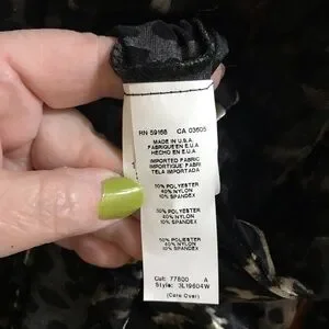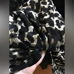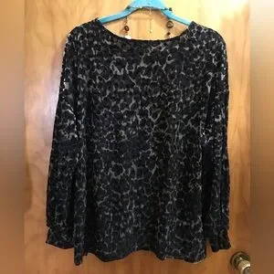 Elevate your style with this black leopard print top. Perfect for any occasion, this top combines comfort and fashion effortlessly.cit features gathered long sleeves and a knot in front at bottom band. Like a no tuck, tuck. Approx. 25” P2P, 26.5” long at sides, 23” at knot.