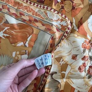 Limited edition vintage caramel and multicolor 100% silk Gucci for Chicago Lyric Opera 25th Anniversary square scarf. Depiction is of dancers, musicians, animals, and flowers with delicately rolled edges. Would make a stunning art piece in a frame.
