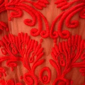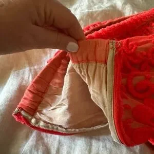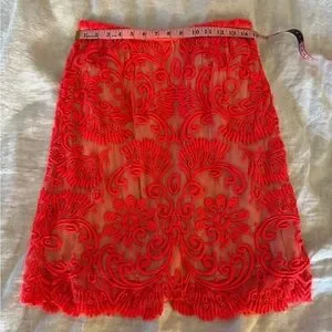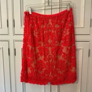 Beautifully detailed neon orange embroidered skirt with nude lining. Zipper side closure. In good condition.