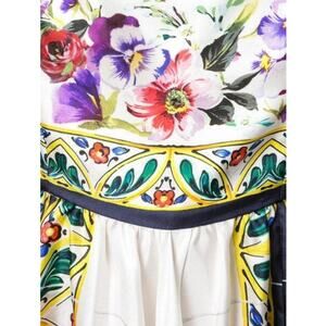 Step into the vibrant world of Dolce and Gabbana's 2017 Capri collection with this exquisite Majolica floral panel dress crafted in Italy from luxurious white silk. The standout feature of this dress is its asymmetric hem on the pleated skirt, adding a touch of modernity and movement to the classic silhouette. The iconic Majolica print, inspired by traditional Italian ceramics, adorns the entire garment, creating a captivating and eye-catching design. The dress also features tie-up shoulder straps and a square neckline. With its empire waist and fluid skirt, this knee-length dress effortlessly flatters the wearer's figure and exudes a sense of timeless sophistication. Embrace the essence of Dolce and Gabbana's signature style with this enchanting dress.