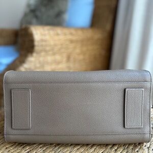 This elegant tote is crafted of luxuriously textured calfskin leather and features rolled leather top handles, an optional shoulder strap, and short side straps that can be undone to increase the width of the bag.