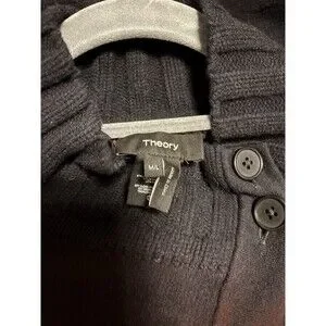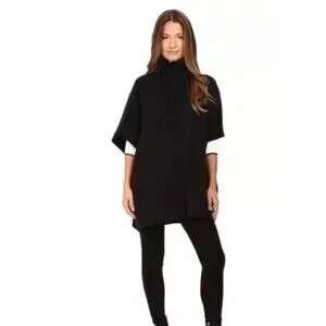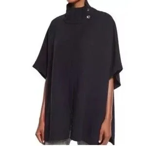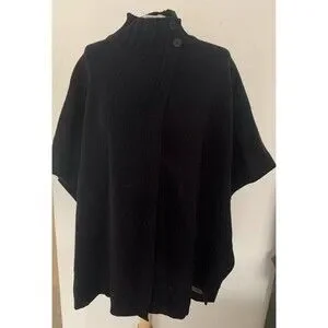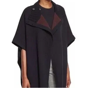 This is a Theory Palomina Plumose It features a solid red and black color with a tight-knit wool blend fabric. The sweater has a high neck and sleeveless cape-style design with button accents. The fit is relaxed and oversized.