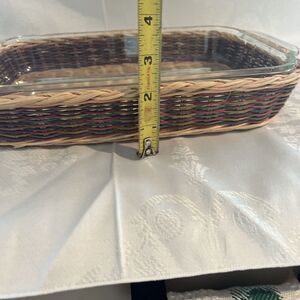 Vintage PYREX 2 Qt. 11x7x1.5 Casserole Dish #232-R with Original Wicker Basket. This two-piece set includes a clear glass casserole dish measuring 13 inches in length and 9 inches in width. The dish is placed in a wicker basket for serving. It is a vintage item from the brand PYREX, suitable for use in a microwave or electric oven.