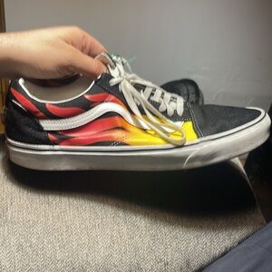Stylish sneakers with a striking flame design. Features black, red, and yellow colors. Perfect for a bold look.