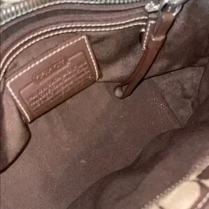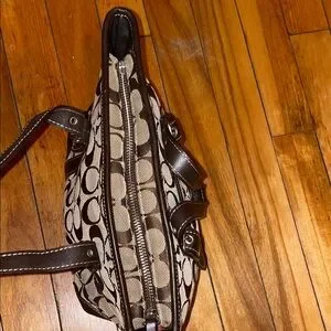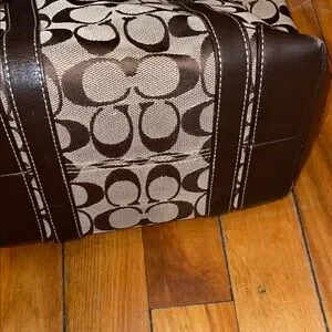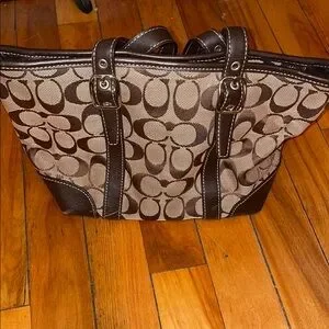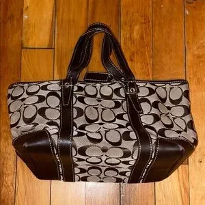 Stylish Coach tote bag with signature pattern. Features black and cream colors.