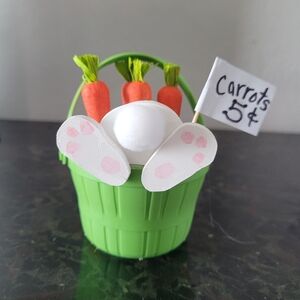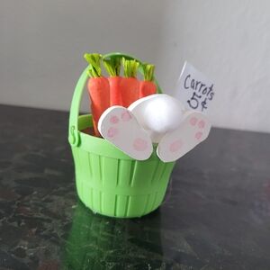 Charming bunny decoration. This bunny loves his carrots! Baskets comes in pink, blue, green and purple. They are handmade so slight minor differences may occur in each piece. 8 available. Perfect for seasonal decor.