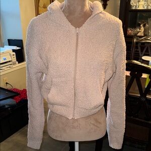 Stay warm and stylish with this cozy cream hooded jacket. Perfect for layering, this jacket offers comfort and a chic look for any casual outing.