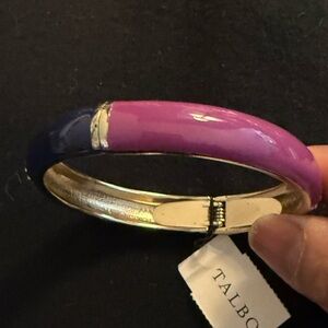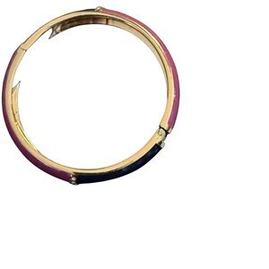 Stylish bangle with gold and pink enamel accents. Perfect for adding a pop of color to any outfit.