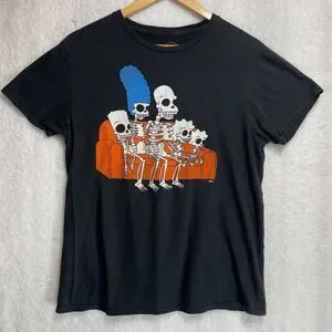 Celebrate your love for The Simpsons with this unique Halloween-themed graphic t-shirt. Featuring the iconic Simpsons family as skeletons on the couch, this shirt is perfect for fans of the show. In size medium, the soft black cotton tee is great for everyday wear or as a fun addition to your Halloween wardrobe. Made in Mexico from 100% cotton, its comfortable and breathable.