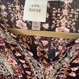 This Knox Rose blouse features a relaxed style with a short sleeve design, perfect for a casual yet chic look. The earthy brown and pink colors create a harmonious palette, complemented by a rounded neckline with a subtle v-cut. Crafted from a light and flowy fabric, this top offers both comfort and elegance.