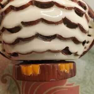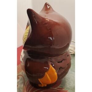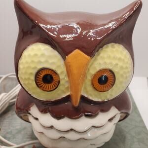 Small chip on base pictured. Add a cozy touch to your space with this vintage ceramic owl night light. The adorable owl features a warm brown finish with a light sensor that activates its glowing eyes, creating a magical ambiance in any room. This charming bedside lamp is perfect for kids and teens, but its retro style makes it a great addition to any decor.