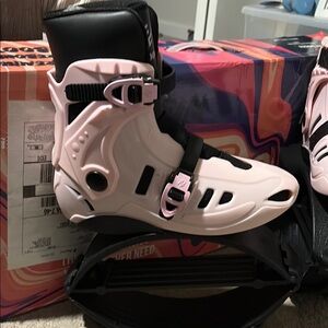 Stylish pink rollerblades with black accents. Perfect for outdoor fun.