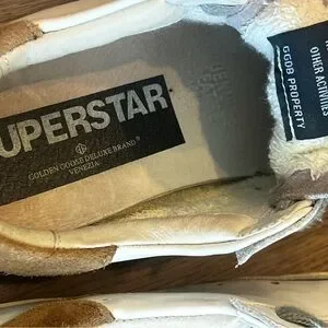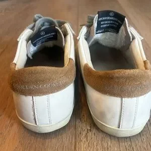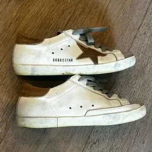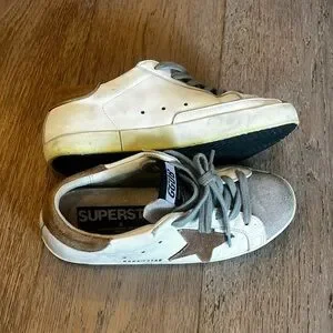 Stylish Golden Goose sneakers with bronze star detail. Features white leather, and gray and bronze suede accents. Comes with a branded dust bag.