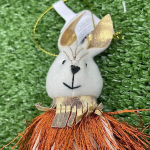 This rabbit Christmas tree ornament is made with a soft and lightweight fabric, and comes wearing a gold-tone dress with sequins for a festive look. Plus, it comes with a built-in loop for easy hanging.