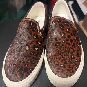 Trendy slip-on sneakers with a bold leopard print. Calf Hair textured and stunning brown and black color.