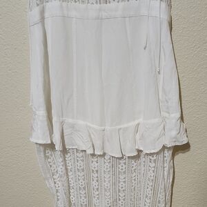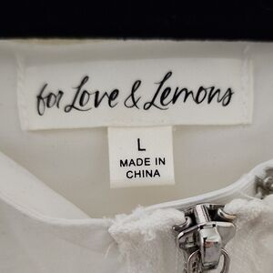 This stunning white sheath dress by For Love And Lemons features a chic peplum waist and a flattering V-neckline, perfect for a bride's special day. The sleeveless design and midi length add a touch of elegance, making it an ideal choice for a memorable occasion.