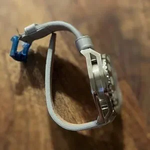 Silver bezel and a gray leather strap finished with red stitching. The watch features a reliable quartz movement, making it both accurate and durable. Water-resistant up to 500 meters.