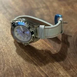 This watch comes with its original box and packaging. Features mother of pearl dial and chronograph, adding to the watch's functionality and design.