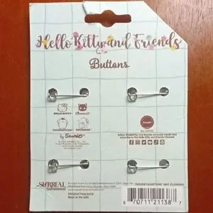 Cute button set featuring Hello Kitty and Friends. Includes colorful designs with characters like Hello Kitty, Tuxedosam, Chococat, and Pompompurin. Perfect for fans and collectors.