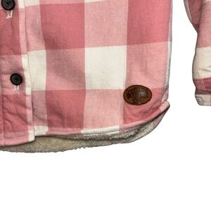 Outdoor Kids Girl's Shacket Shirt Jacket in Size Large. Button Down Flannel Shirt with a Sherpa Lining. Pink and White Buffalo Plaid Pattern. Long Sleeves. Good Condition.