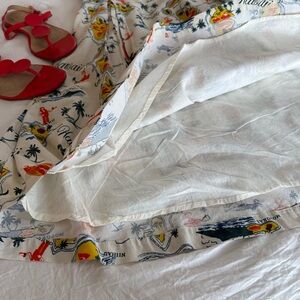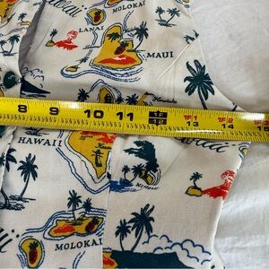 Modcloth "Genuine Genius Shirtdress" in Island is beige with an all over Hawaii-theme print of islands, flowers, palm trees, volcanos, hula dancers and other images in shades of forest green, yellow, orange and blue. Adjustable halter neckline with two fabric-covered green buttons at the top, a collar, princess seams, green fabric-covered buttons down the bodice, pleating at the waist, and a hidden side zip and hook closure. (The front buttons are functional).