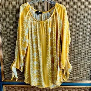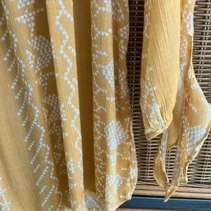 Fred & David Tunic. Elastic scoop neckline. Elastic & ties at wrists. Gold & white design. 65% rayon 35% polyester. Very lightweight. Beautiful on a sunny day.