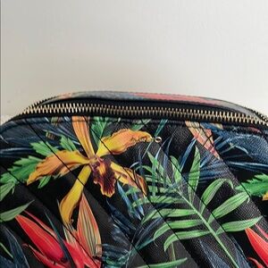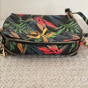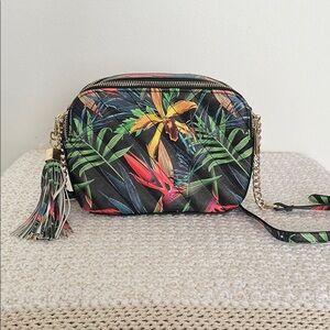 Add a splash of color to your outfit with this vibrant tropical print crossbody bag. Perfect for any occasion.