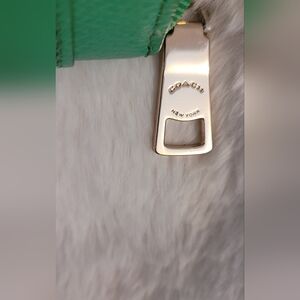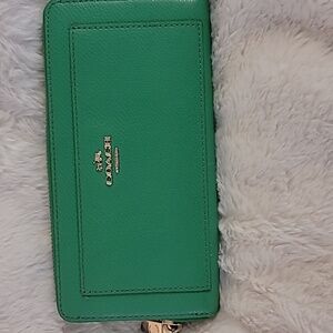 This sleek Coach wallet in a vibrant green hue is crafted from high-quality leather, offering a smooth and glossy finish. Its zip-around closure ensures your essentials are securely stored, while the minimalist design highlights the brand's iconic style. Some wear on wallet.