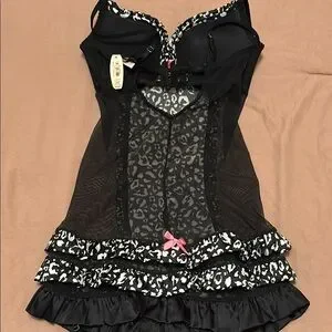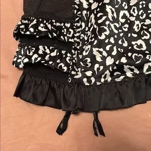 VICTORIAS SECRET SEXY black and white leopard print bustier with pink bow accent. Features adjustable straps and ruffle details.