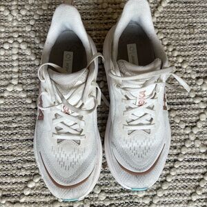 Color white with rose gold accents and sky blue touches on the soles.
