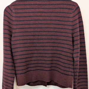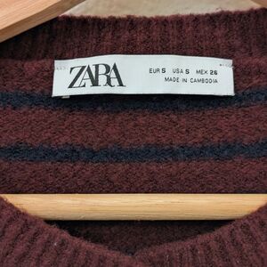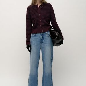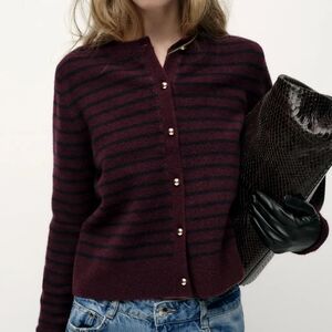 This Zara cardigan features a vibrant burgundy and navy blue color palette, perfect for adding a pop of color to your outfit. The round design and fine knit texture offer a sleek and comfortable fit, making it an ideal choice for layering in cooler weather.