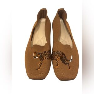 Women’s Square-Round Toe Canvas Stretch Knit Cheetah Brown Flats Loafers SZ 8.5