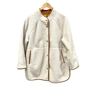 Stylish cream color sherpa coat with tan suede lining & accents. Features a zippered & snap front, deep side pockets and split sides. Very warm. Tags have been removed but measures L-XL as shown in pix. Beautiful coat in Excellent condition from a smoke free home.